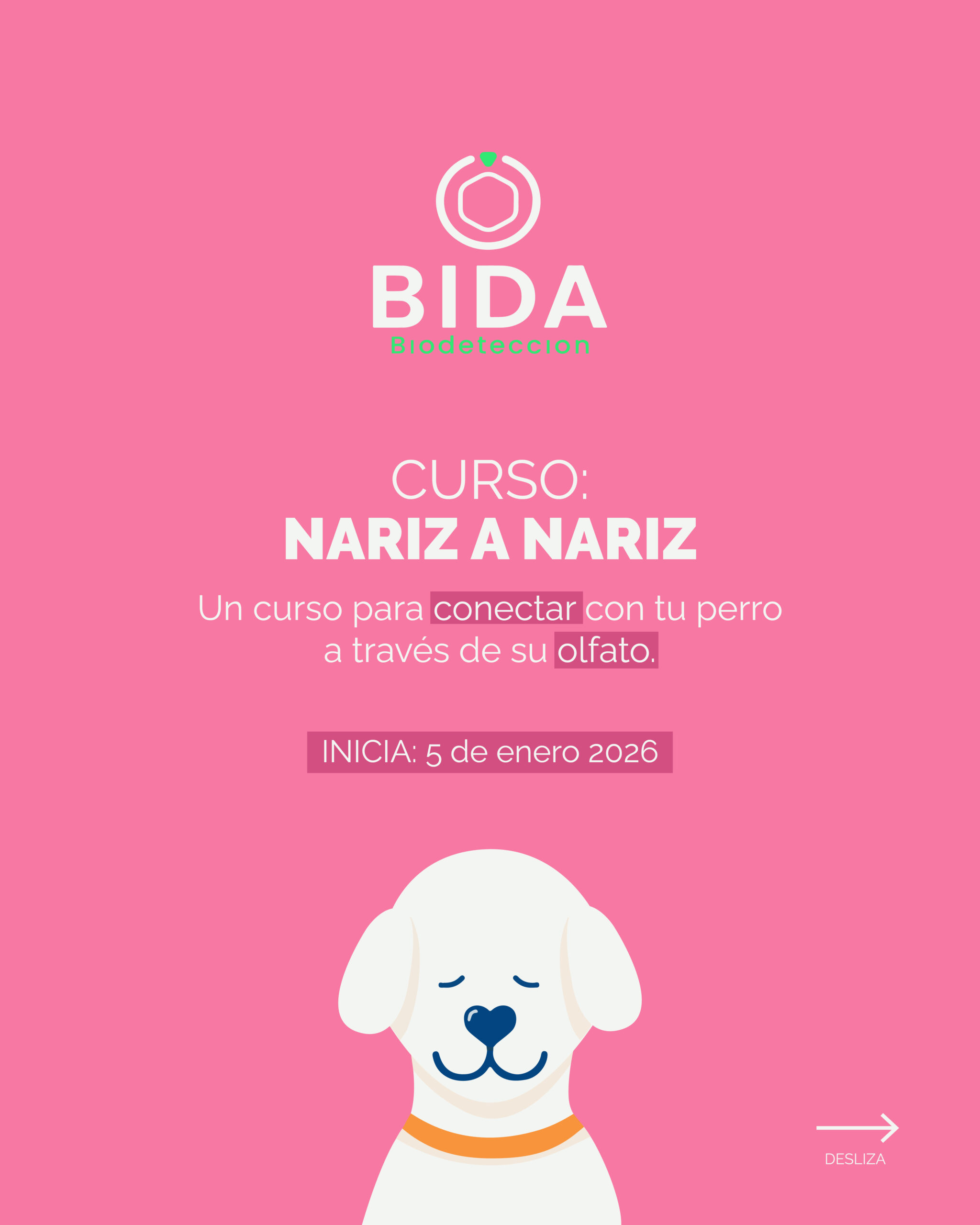 Nariz a Nariz es un curso creado por BIDA para que aprendas a estimular el olfato de tu perro como juego, práctica de concentración y bienestar. Es ideal para cualquier perro, sin importar su edad o nivel de actividad.